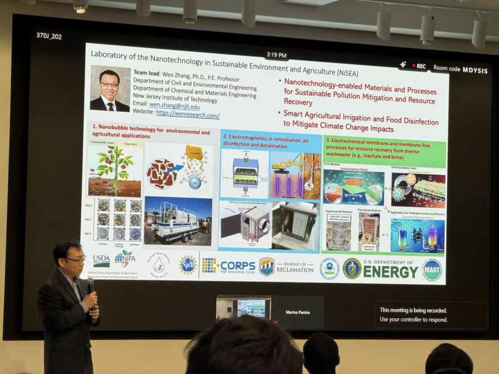 In a separate session, Dr. Wen Zhang delivered a lightning talk highlighting the research activities of his group at NJIT. He outlined ongoing work in environmental nanotechnology and membrane-based systems, including nanobubble-enabled processes, reactive membrane filtration, and advanced treatment strategies for pollutant removal and resource recovery.